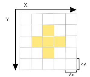 $$\frac{P_{x,y+1}(t) - 2P_{x,y}(t) + P_{x,y-1}(t)}{\Delta y^2}$$are the discrete approximations for the second derivatives, \(\frac{\partial^2 P}{\partial x^2} \) and \(\frac{\partial^2 P}{\partial y^2} \).
