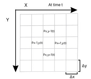 $$ \frac{P_{x,y}(t + \Delta t) - P_{x,y}(t)}{\Delta t} $$is the discrete approximation for \(\frac{\partial P}{\partial t} \).